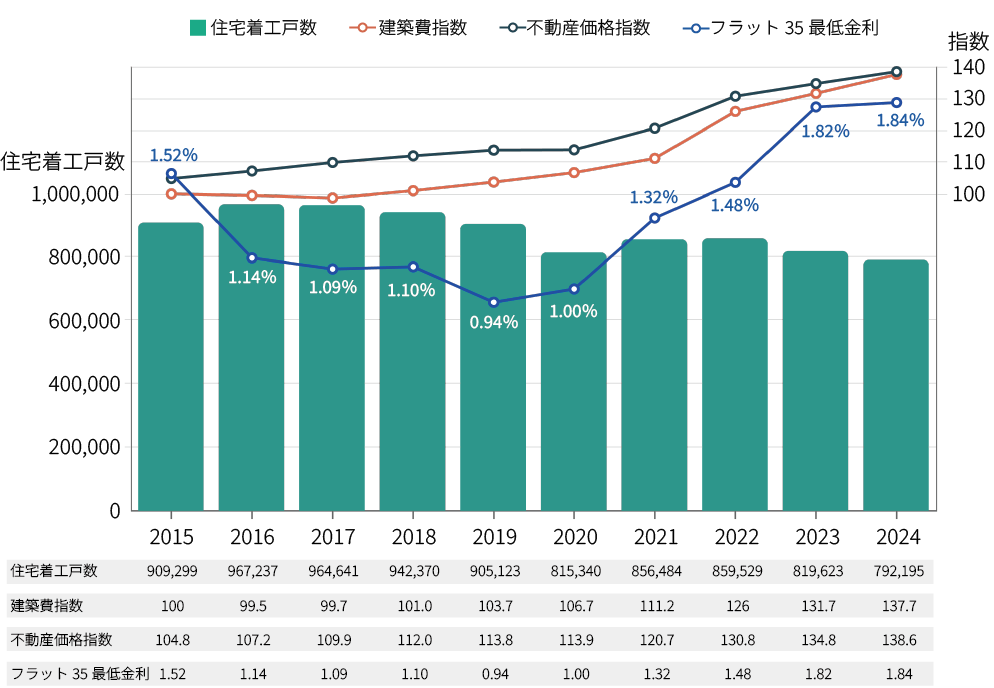 着工戸数の減少と不動産価格の上昇が同時に見られる背景には、建築コストの高止まり人手不足などにより供給が抑制される一方、都市部を中心とした住宅需要が一定程度維持されていることが挙げられます。