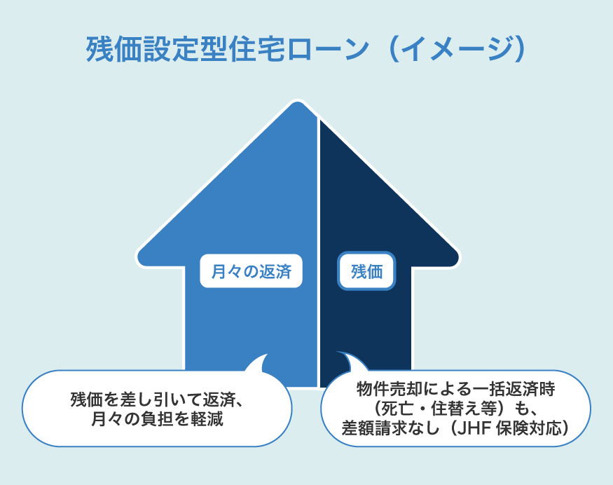 月々の返済負担を抑える仕組みとして、残価設定型住宅ローンの普及を支援するための「特定残価設定ローン保険」が新たに創設されます。残価設定型住宅ローンは、将来の住宅価値に相当する部分を返済対象から切り離し、主に居住期間中の返済額を抑えることを目的とした仕組みです。