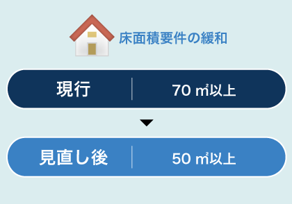 これまで一戸建て住宅等では、床面積70㎡以上がフラット35の対象要件とされていましたが、今後は50㎡以上へと要件が緩和されます。